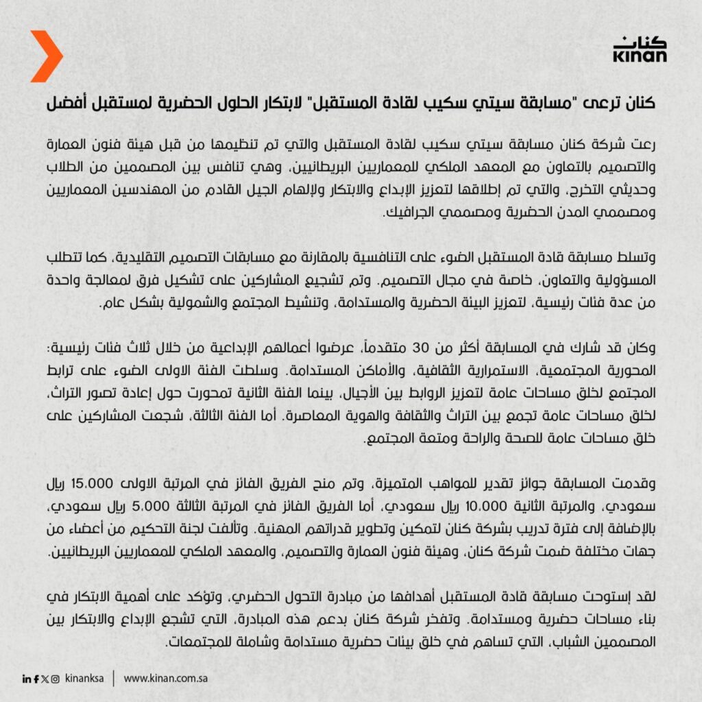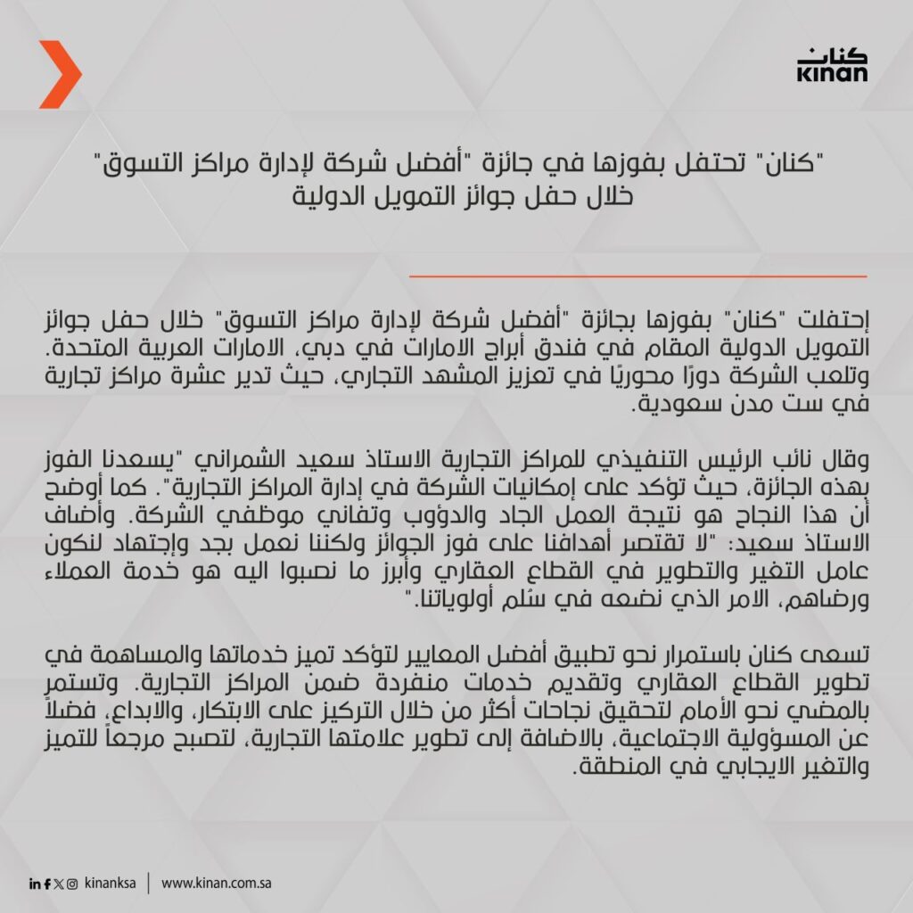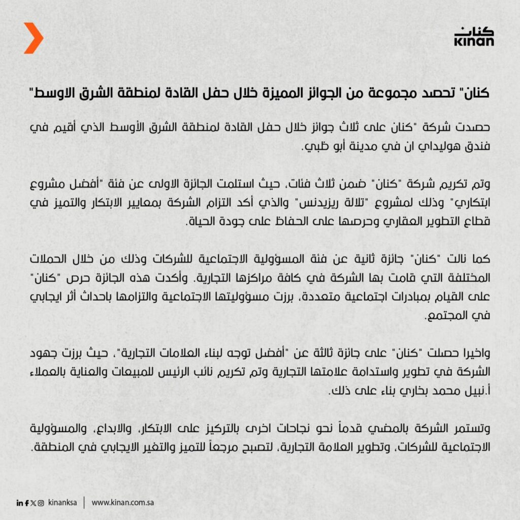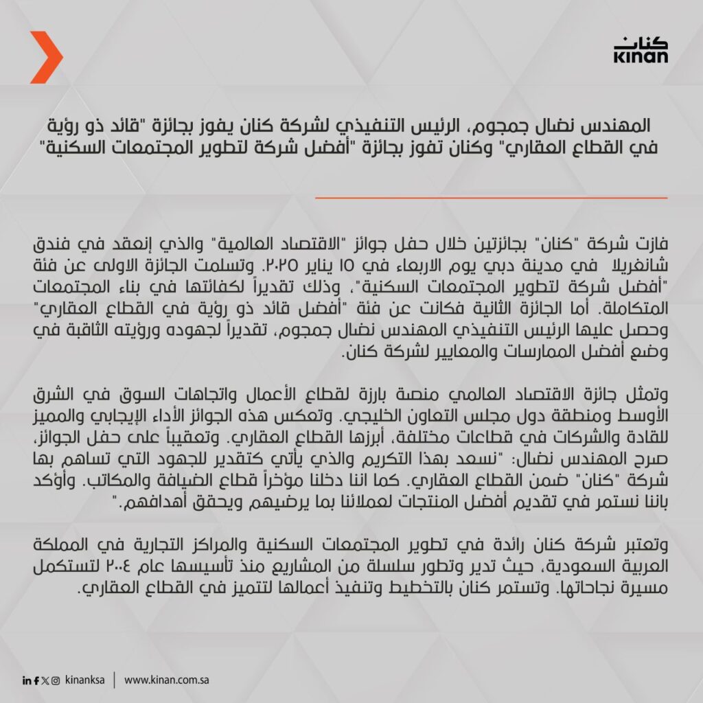 سعداء بالإعلان عن فوز شركة كنان للتطوير العقارية بجائزة