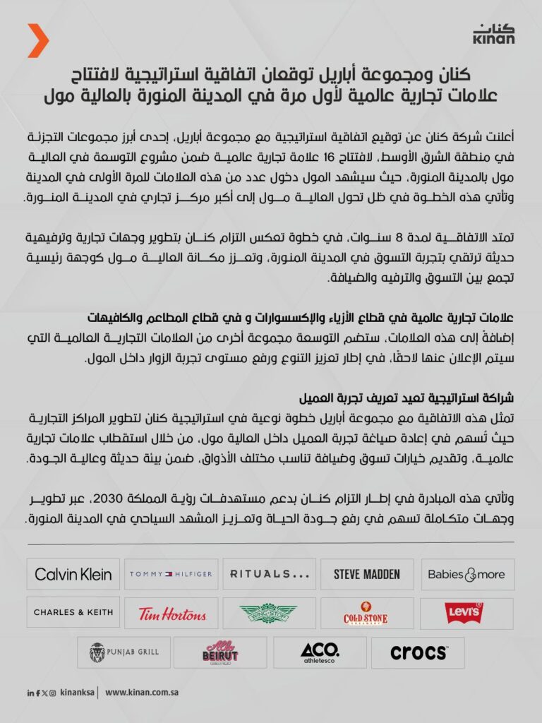 وقعت شركة كنان مع شركة الطيار العربي للمقولات عقد تطوير وتوسعة العالية مول بالمدينة المنورة بقيمة إجمالية تبلغ 120 مليون ريال وذلك بالمكتب الرئيسي لشركة المقر والتي تعد الذراع الاستثماري لأمانة المدينة المنورة